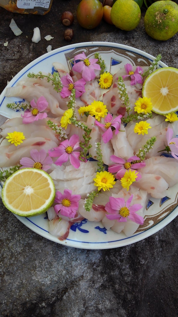 本日のスペシャリテは師匠の釣ったメダイに、庭先の菊、穂じそ、コスモスとゆずをあしらって。