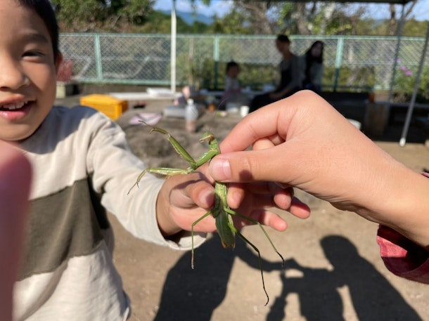 食後にお兄ちゃん達は虫と遊ぶ。カマキリさんご苦労さん。