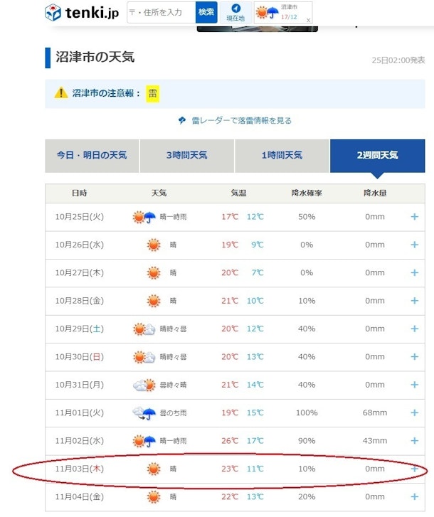 11/3の天気予報が気になる