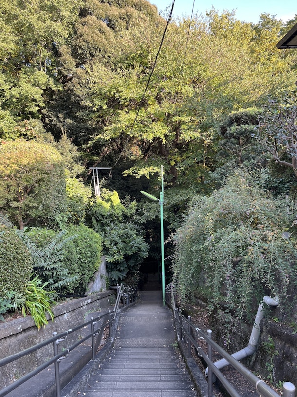 野毛大塚古墳から等々力渓谷に降りる入口です。今日の午後2時過ぎで、渓谷内部は真っ暗に見えますが、大丈夫。実際は木漏れ日が沢山差していますので、それなりに明るいです。野毛大塚古墳から等々力渓谷に行く際ここを通ります。