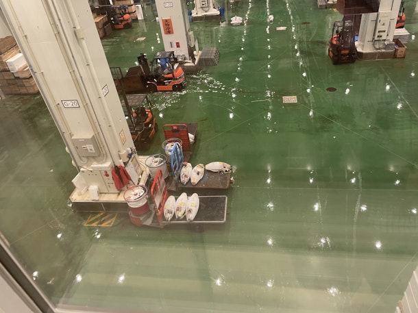 綺麗な緑の床にターレーに乗った数匹の冷凍マグロ。