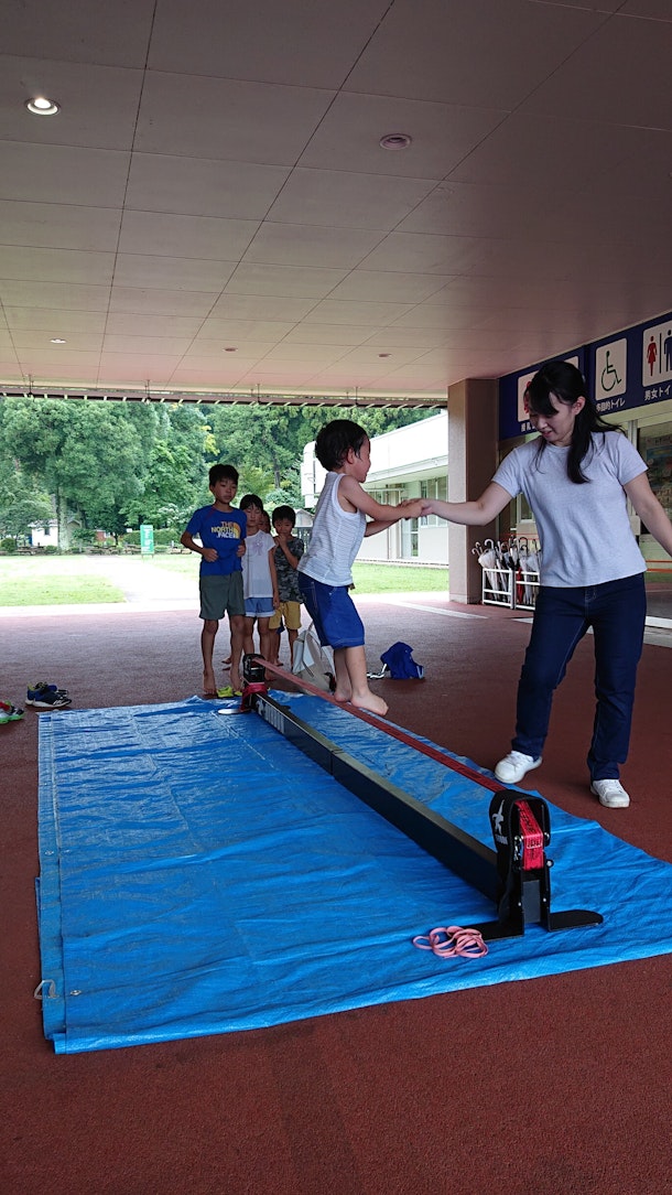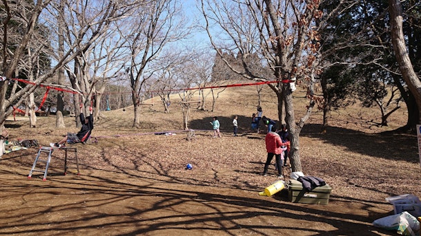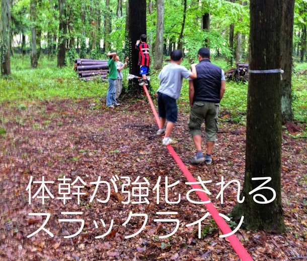 一般的には長さ10m 程度で膝くらいの高さにラインを張って、その上で歩いたり座ったりジャンプしたりといろんな動作をして遊びます。いきなり歩くのは難しいですが、歩けなくても乗っかるだけで笑えます。