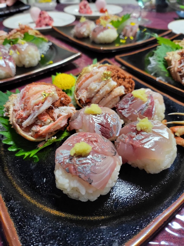 ゲストさん作の香箱蟹とアジの手毬すしです!