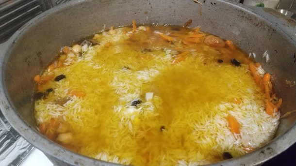 プロフはインド米、牛肉、大量の人参と玉ねぎ、ウズベキスタンのスパイスとウズベク料理に欠かせない「カザン」鍋で作りました。正しいプロフのポイントは大量の玉ねぎは全部溶けてしなってそのうまみはポイントとなる。
