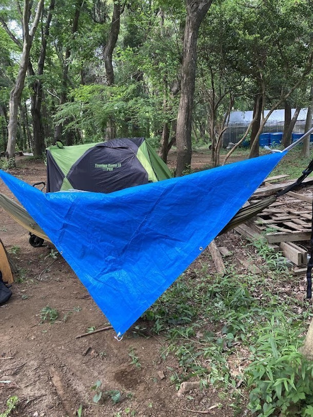 写真は少しわかりにくいですが、ブルーシートの中にハンモックを張っています。