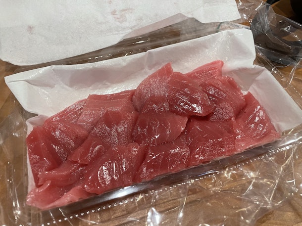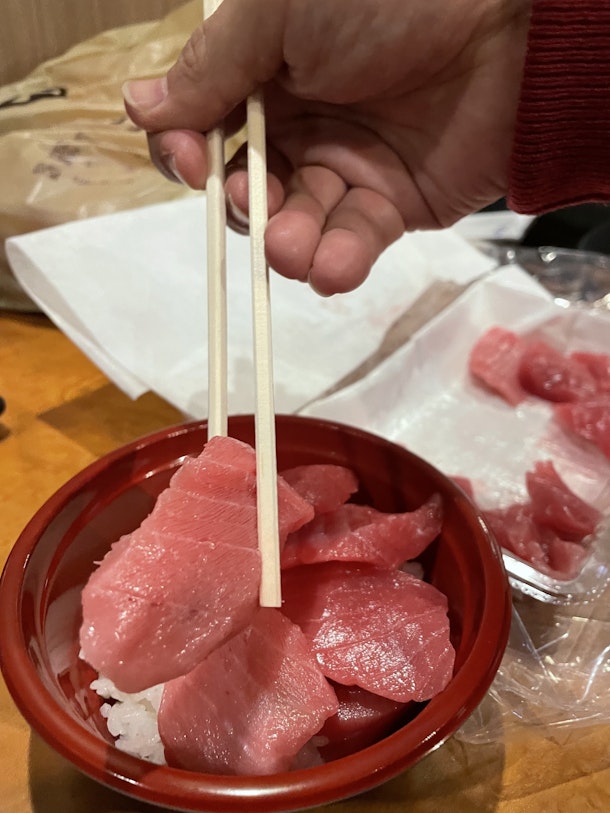 豊洲市場の生本マグロ中トロ。買ってきて勝手に丼作成中。知人と分け合いました。2500円です。