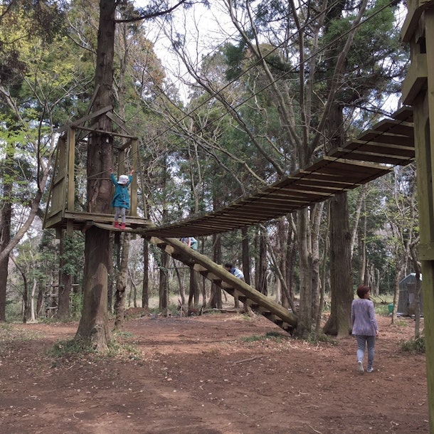 森の中には釣り橋、ツリーハウス、ジップラインは常設されております。また、さくランドで所有しているスウィングライン(忍者ライン)、ハンモックは常設致します。