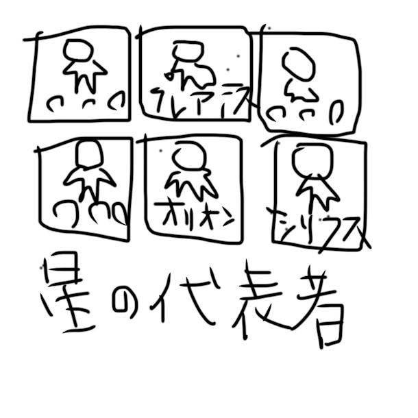 空間に、たくさんの星の代表者が集まっていまして、星の名前と、代表者の顔が映し出されていました。