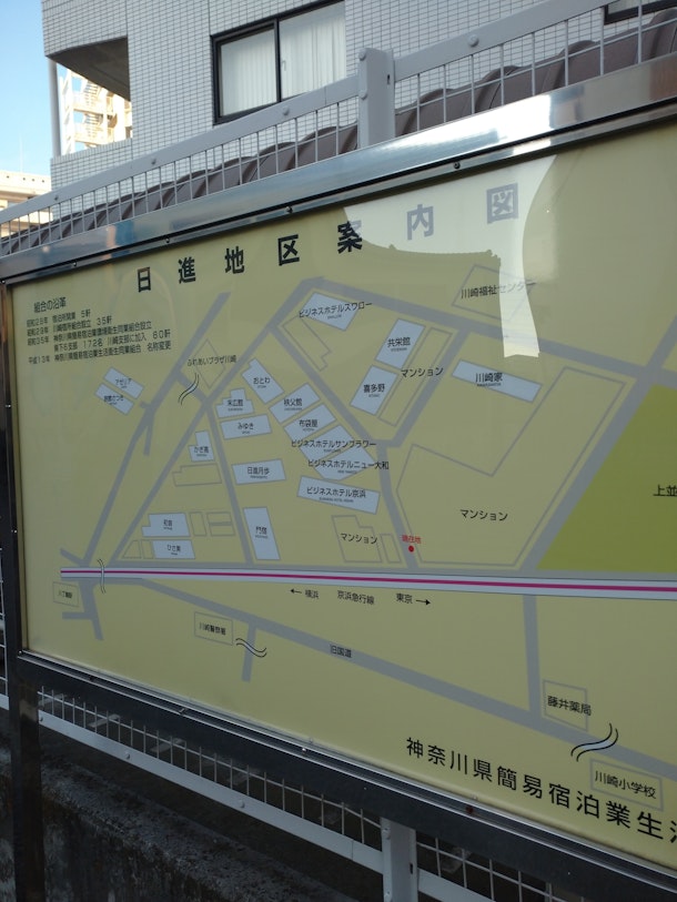かつて、日進町は日雇い労働者が多く集まる地区であったらしく、神奈川でも有名な【ドヤ街(日雇い労働者が多く住む街、またその簡易宿舎がある街)】だったとの事。近年では川崎市中心部に近い立地条件を生かして、川崎市が簡易宿泊施設に外国人観光客を呼び込んだり、地元企業が古いビルをオフィスやスポーツ、飲食などのための複合施設にリノベーションしたりするなどの動きが見られる為か、町全体が昭和レトロな良さを保ちつつ洗練された街に変化しているように感じるのである。
