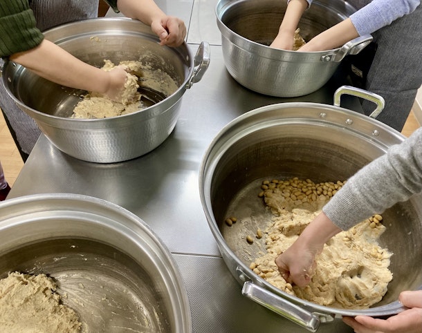 こちらの体験は、参加者の皆さんで、お味噌仕込みの準備、調理、片付けまでの一連の工程を