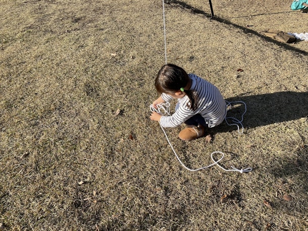お昼の後は、サバイバルスキルのひとつにもなるロープワークを学びながら縄ハシゴづくり!