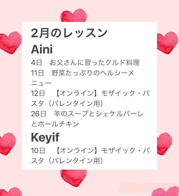 バレンタインからクルド料理に、それから野菜沢山のトルコベジテリアン料理に幅広い1ヶ月のレッスンスケジュールです🧿
