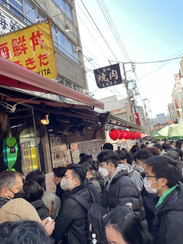 海鮮丼、食べ歩きの店がおおい仲通りも通れない。