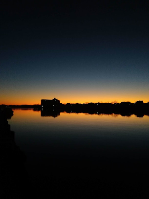霞ヶ浦につくと、穏やかな水面に朝焼けが写ってとてもきれいです。