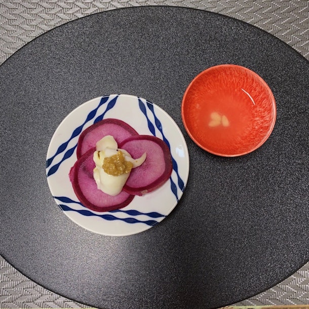 薬膳酒と一緒に新年を祝うのは、紅白の「赤大根とゆり根の柚子味噌仕立て」、消化を良くし気の巡りを良くする薬膳です。