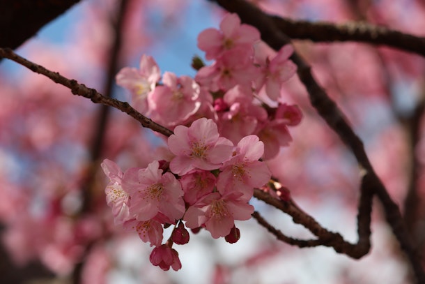 神奈川県松田町は一年で一番観光客が来る場所です。それは、この時期に見える「早咲き桜」です。富士山と桜を背景に、春を感じる季節。