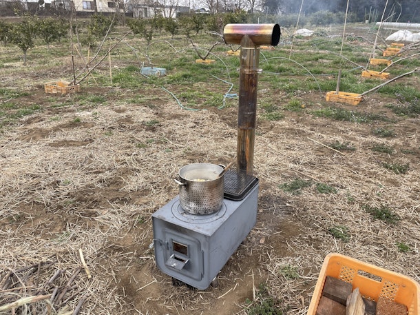 夏場と違い、収穫するものも少なく、植え付け自体はあまり時間も切りませんので、一緒に薪ストーブで豚汁、ポップコーンを作りました。