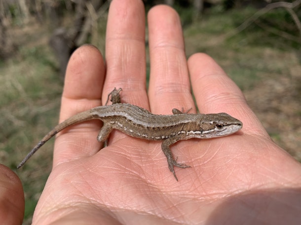 カナヘビ、ようやく冬眠から目覚めたようです。よく見ると尻尾の色が途中から変わっていて、再生した尻尾だという事が分かります。厳しい自然を生き抜いてきたオーラがでております。かっこいい。