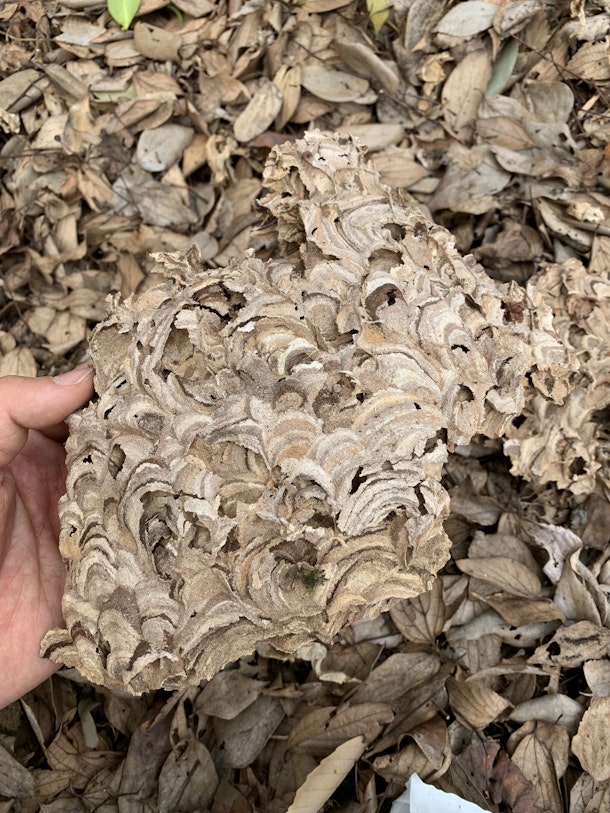 スズメバチは女王以外は秋までの命です。だから巣は空っぽです。空き家が風で落ちてきたのでしょうか。これも普通に歩いていたら見逃してしまいますね。