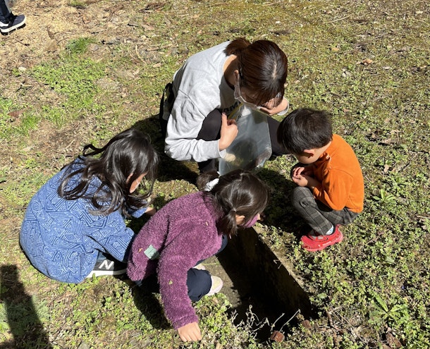 いっぱい見つけて帰ろうと思ったら、蛙の卵がいっぱいある池がありました。大量の卵にびっくりしていたら、カエルがぴょこんと動きました。見事に捕獲成功し、肌触りを楽しみます。