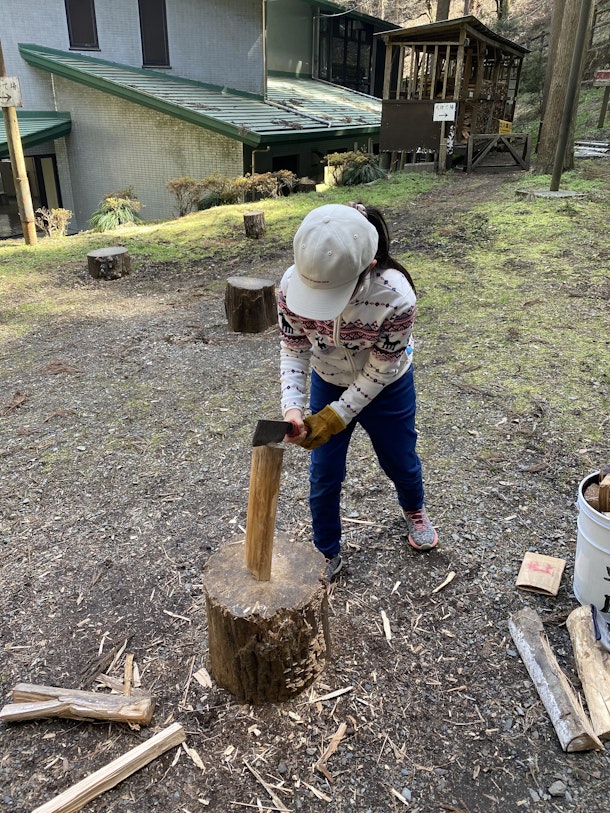 戻ってカートンドック作りです。まずは火起こしから。人生、はじめての薪割り挑戦する子もいました。