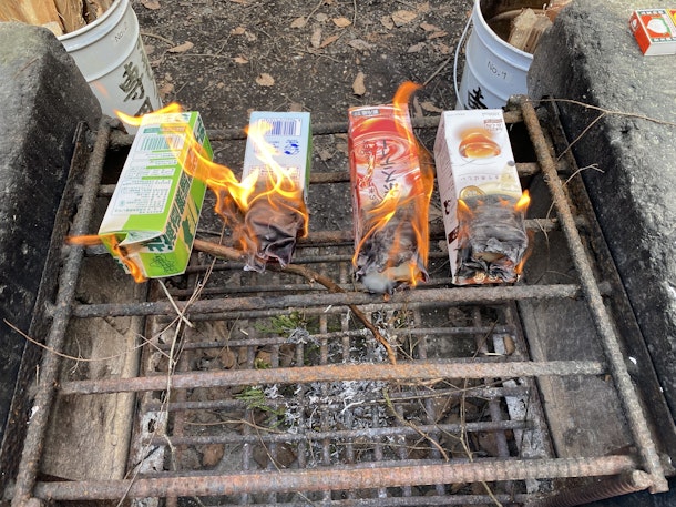 先ほどの牛乳パックに点火してしばらく放置すると、いい焦げ目のホットドッグの出来上がり!