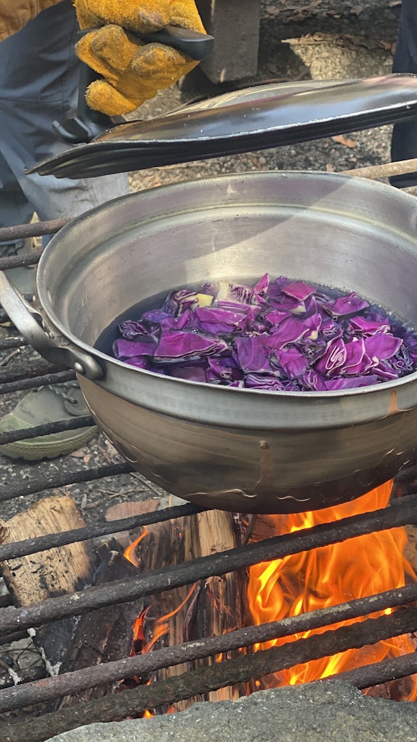 お昼ご飯を食べながら、紫キャベツの茹で汁も作っていきます。お湯の中にキャベツを入れるとすぐには変化がありませんでしたが、次第に色づいていき、あっという間に濃い青のゆで汁が出来上がりました。