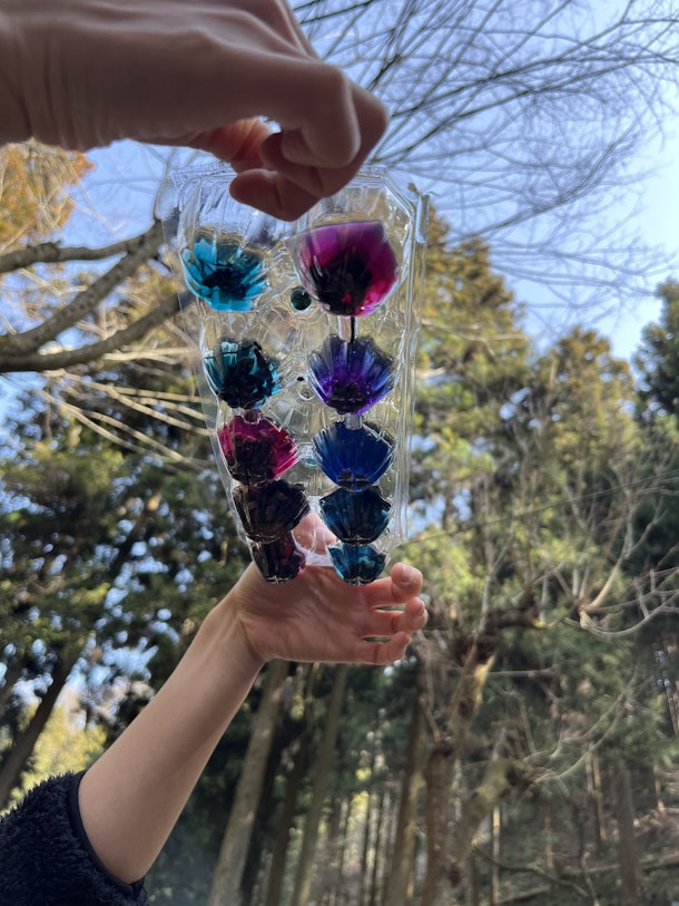 今回の企画は、「森の素材で実験会」。紫キャベツで作ったBTB溶液で、森の中のものの酸性とアルカリ性を調べます。さらにろ過装置作りも。午前中はそこに使うためのものをまずは拾いにいきます。すっぱそうな酸性のもの、にがそうなアルカリ性のもの、ろ過に使えそうなもの、燃えやすそうなもの、そしてとにかく気になるもの!そんなものを探しにいざ探検へ出発✨