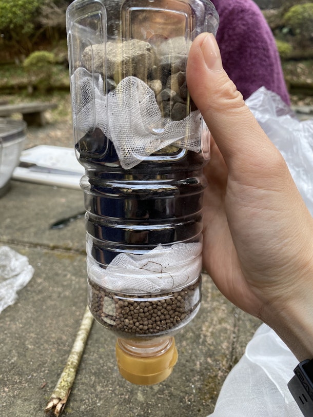 そんな傍ら、もう一つの実験の辺ろ過装置にもトライ。砂利、石、カット綿、ガーゼなどを駆使してろ過装置をつくります。