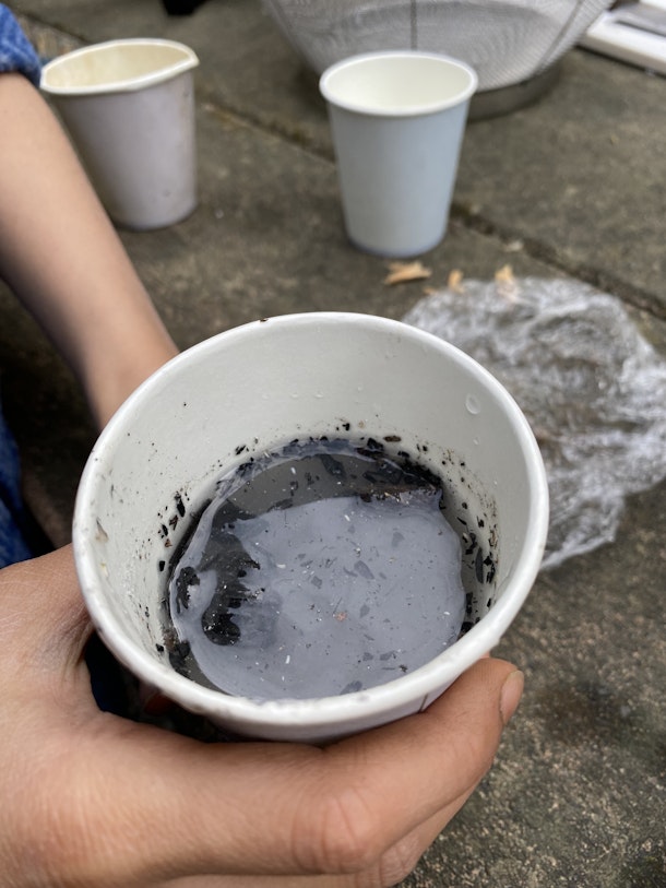 色の変化を確かめたところで、先ほど拾った物たちをどんどん入れて行きます。草や土を入れると、なんとなく緑っぽくなりがちでした。