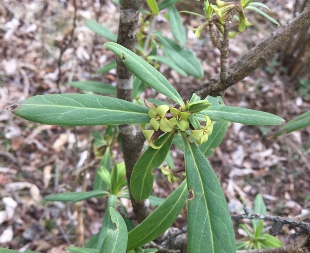 ↓ジンチョウゲの親戚、オニシバリは冬から花を付けていました。今はこんな風です。この植物、ミツマタの親戚。繊維が強くてあまりシカにも食べられません。