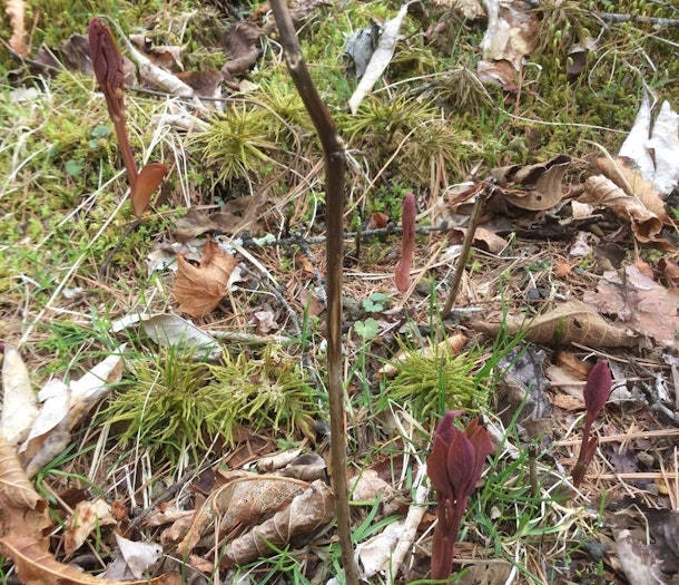 ↓あっという間にヤマシャクヤクの芽もこんなにたくさん。今年の5月にはヤマシャクヤクを見に来ませんか。ヤマシャクヤクのお花見しましょう。咲きそうになったら記事をアップします。これは昔から薬用。だからシカにも食べられずに元気に咲くでしょう。