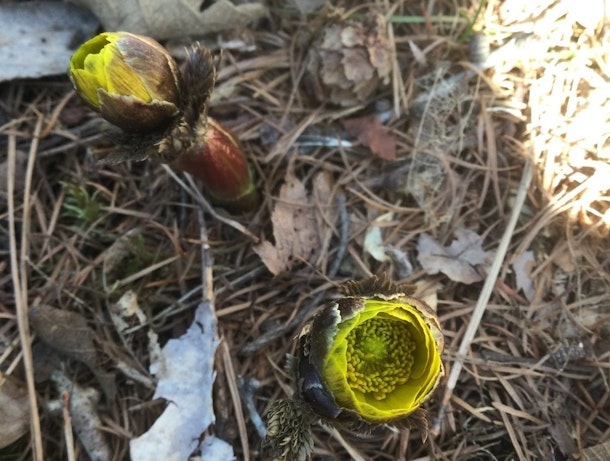 ↓フクジュソウ、少し前は地面から花が顔をもたげていただけだったけれど。こんなふうに。