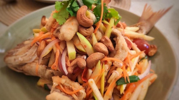 タイシーフード料理 「揚げ魚のスパイシーハーブソース」