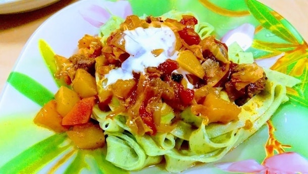 ホラズムと言えば世界遺産「ヒヴァ」です。砂漠の真ん中にある青いドームのオアシスで生まれた香草が練りこまれた緑の麺のラグマンです。食欲が落ちる夏の時期によく食べる料理で、ハーブ入りの爽やかな味のする麺と、酸味のあるトマトソースは食欲をそそります。ハーブには、ディルなどが良く使われています。真ん中のポテト&肉の煮込みとヨーグルトソースのコラボレーションが絶妙です!