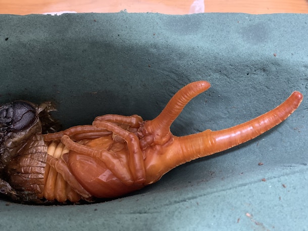 脚(あし)や角が既に形作られています。見れば見るほど、とても神秘的な姿です。よく見ると下に幼虫の抜け殻もあります。