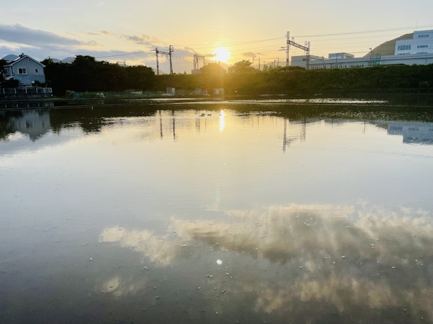 付近では、ちょうど田んぼに水が入り、まだ田植え前で水鏡に映る夕陽がキレイでした😆😆