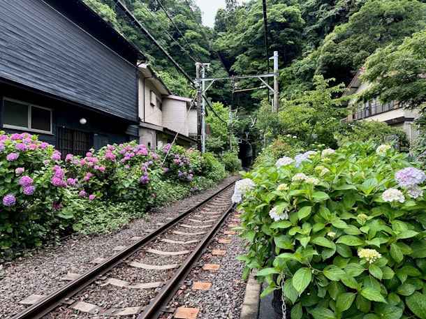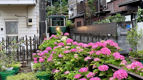 「長谷の路地」コースで人気の紫陽花スポットは御霊神社前。江ノ電の線路際の紫陽花はすでに開き始めていて、
