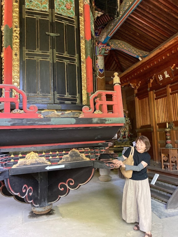 清凉寺の経堂で、輪蔵を回されるゲストさん。