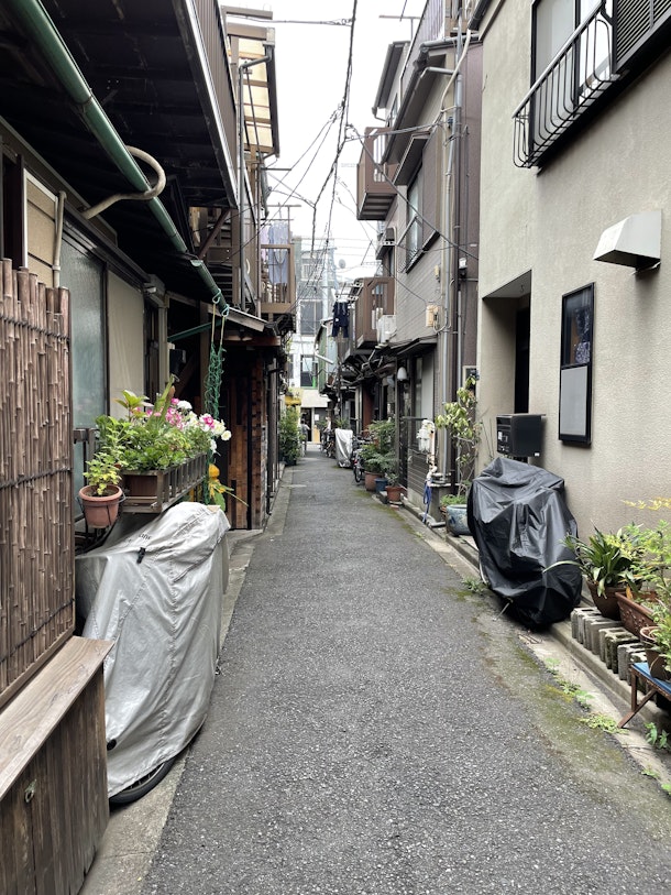 月島の路地、普通の家もあるので、歩くときはしゃべらずに行きますよ!