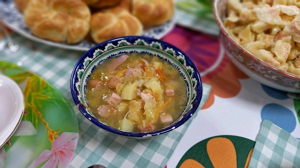具たくさんの食べるキャベツスープで、食べるときお好みでサワークリームとワインを入れて食べますよ。