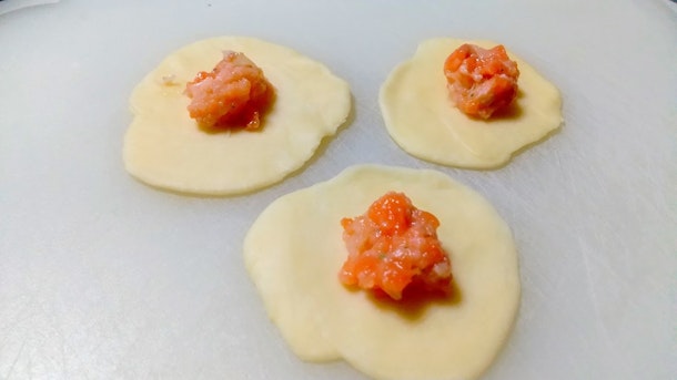 ロシア風水餃子。サーモンペルメニの餡はサーモン、玉ねぎとバターでかわいいピンク色はうっすらと見えています。
