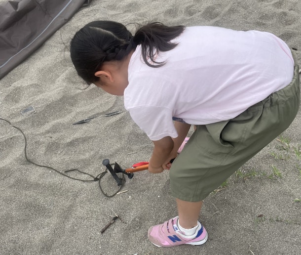 そして、今回も「子どもたちはペグ打ち好き」であることが確認できました。全然興味の無さそうな幼稚園児のお子さんもペグ打ちには積極的です。なぜでしょうね。(写真はお姉ちゃんの方です。)