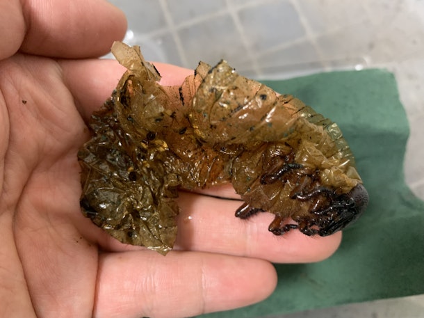ケースに幼虫の抜け殻もまだ綺麗に残っています