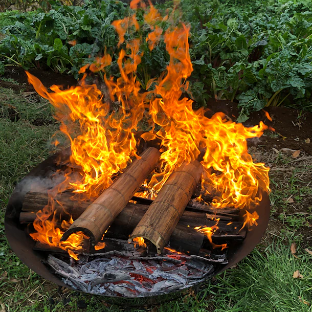 といっても、立派な窯を持っているわけではなく、「無煙炭化器」を使って、庭や畑で竹を焼いて作っています(煙は、燃やす竹が乾いていれば出ないのでご近所にご迷惑をおかけすることはありませんが、火を焚くので、事前に消防署に届け出をしたうえで焼いています)。