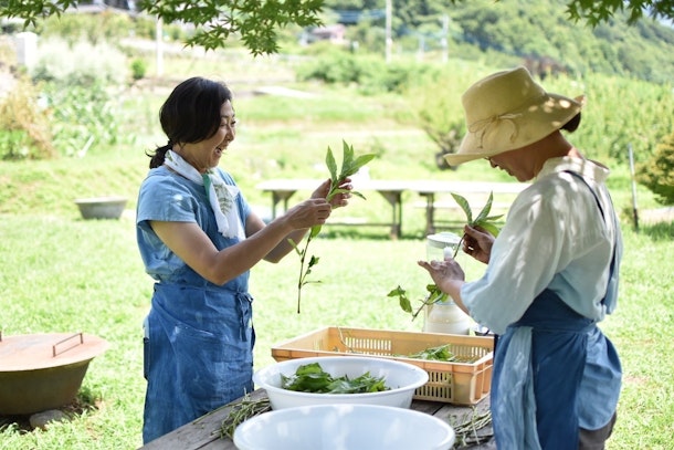 生の、文字通り「生きている」葉っぱを使って染める生葉染め。