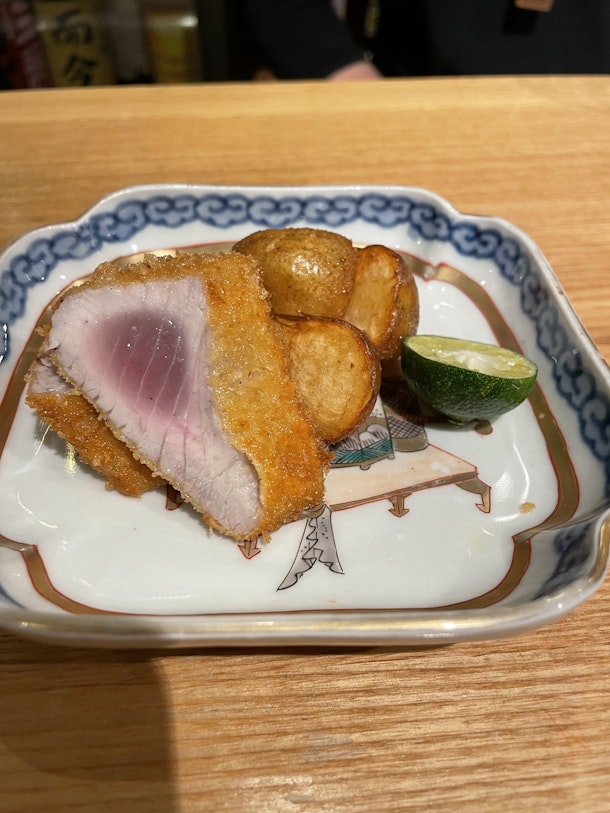 この写真は、生キハダマグロのかつ。マグロのかつだけあって中心部はレアでも全然平気ですもんね。