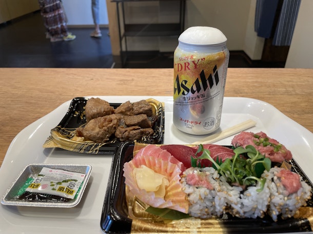 佃煮屋で買えるおにぎり、乾物屋で買える、ビールやワインなどを買って中庭のイートインスペースで食べることが可能です。