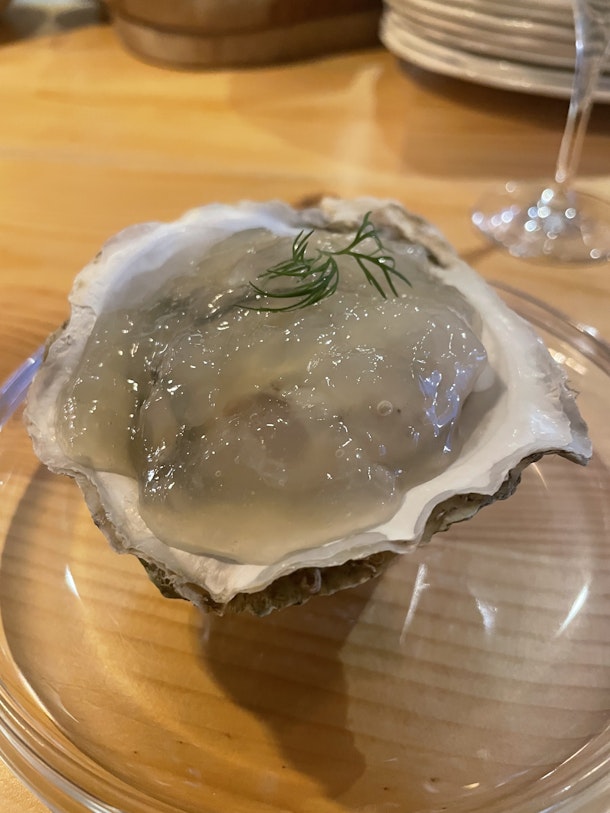 牡蠣の内部の塩を使ったジュレをソースにした生牡蠣。