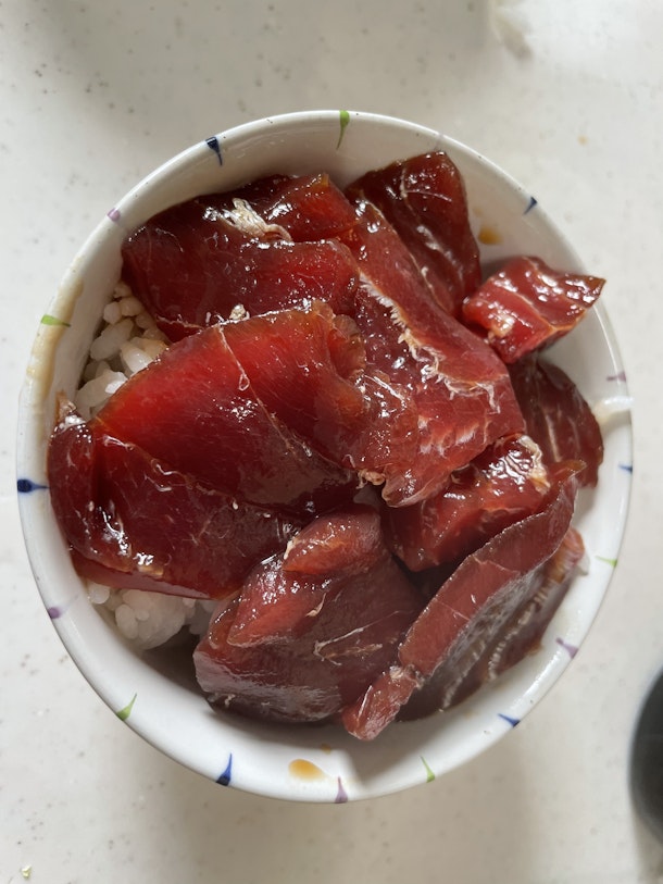 みりんと酒、醤油、ごま油を混ぜた汁に数分つけて少しねっとりのずけ丼へ返信。